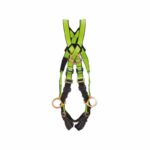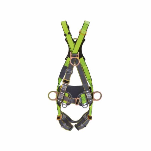 Arnés Cuerpo Completo tipo “X” con cuatro puntos de anclaje Fabricado en reata poliéster de alta tenacidad con una resistencia a la tracción superior a los 5,000 lb y completamente regulable. Hebillas de ajuste rápido en acero estampado y/o forjadas. Argollas en acero forjado con una resistencia a la tracción mínima de 5,000 lb. Sistema ajustable de soporte lumbar acolchado.