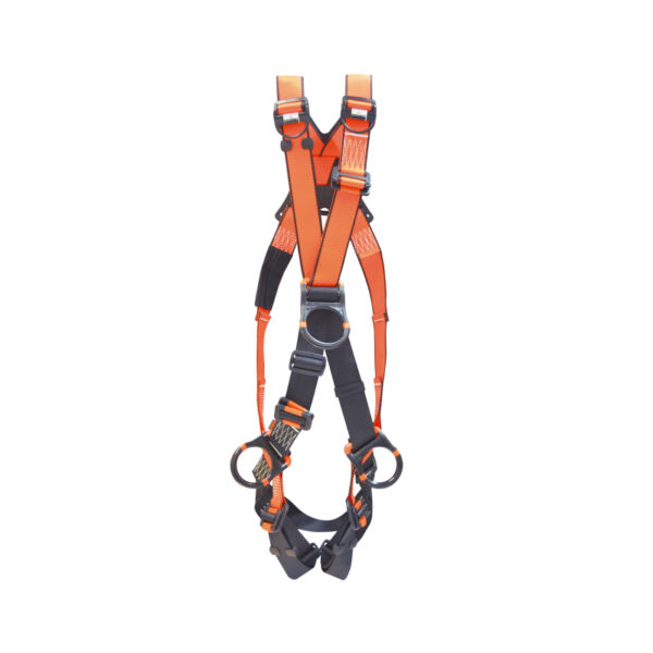 Arnés Dieléctrico Cuerpo Completo tipo “X” con cuatro puntos de anclaje Fabricado en reata poliéster de alta tenacidad con una resistencia a la tracción superior a los 5,000 lb y completamente regulable. Hebillas de ajuste rápido y argollas en “D” con núcleo en acero estampado y/o forjado, poseen un recubrimiento aislado con una resistencia dieléctrica mínima de 9 kV.
