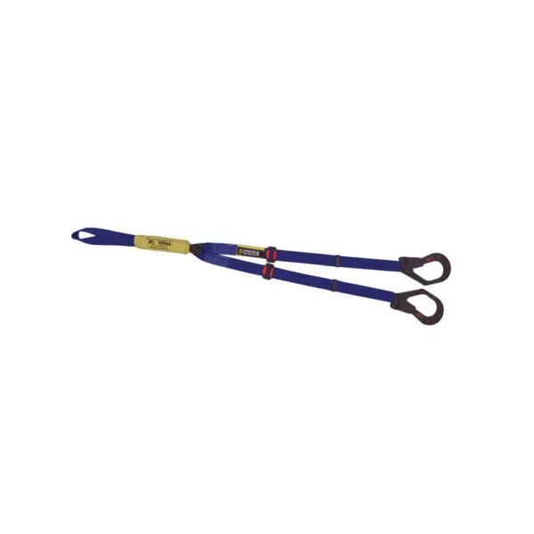 Eslinga regulable con absorbedor de doble terminal; fabricada en reata ignífuga Nomex – Kevlar capaz de soportar una carga de tracción mínima de 7,000 lb. Hebilla de ajuste y ganchos en acero forjado con una resistencia a la tracción mínima de 5,000 lb, poseen un recubrimiento aislado con una capacidad dieléctrica mínima de 9 kV.
